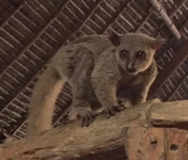 There is only one other group here (2 families together= 8 people). We eat dinner very late (8:45 pm last night) & so everyone gathers at the bar beforehand. Last night we were visited by a bushbaby!