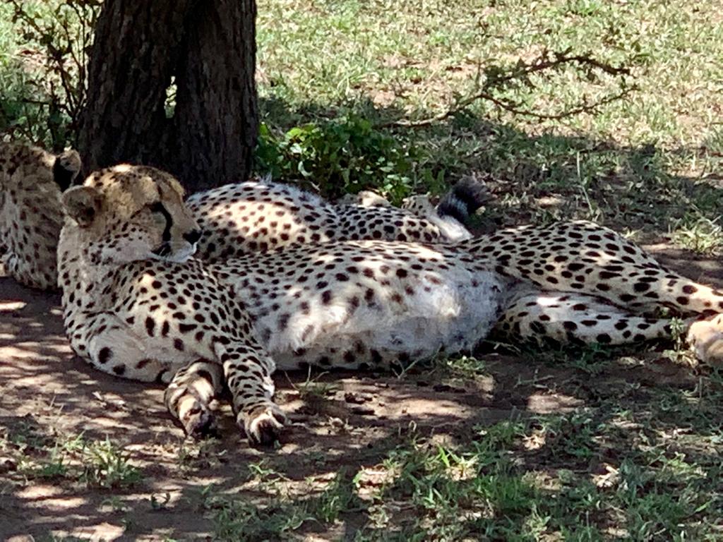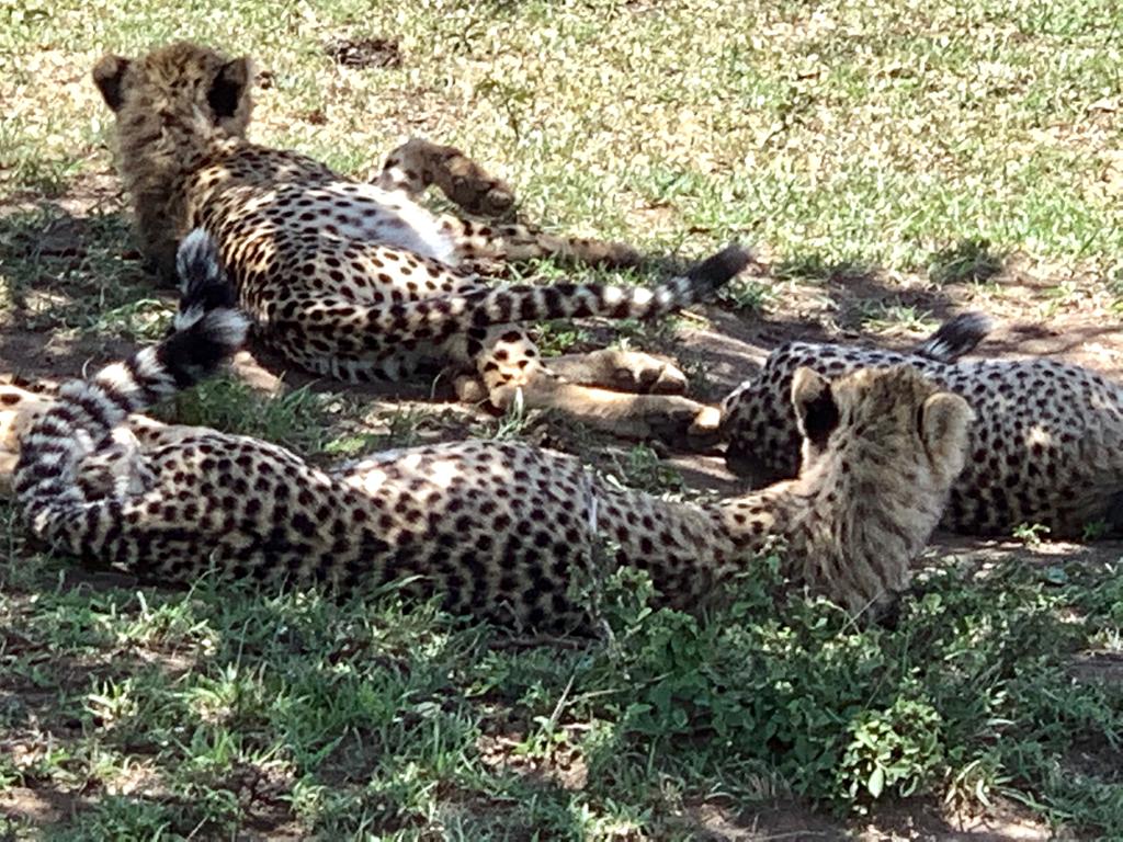 Just before reaching camp we found the mother cheetah and her four cubs—the cheetahs that killed the baby Thompson gazelle yesterday. They had obviously eaten more than that. Look at their bellies! It’s like they have a bowling ball in it!